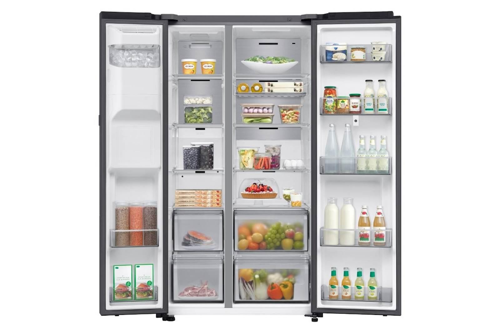 Ameriški hladilnik Samsung RS90F66BEFEO iz linije Family Hub združuje prostornost, vrhunsko tehnologijo hlajenja in pametno povezljivost, ki popolnoma spremeni vašo izkušnjo shranjevanja živil. Z zmogljivo skupno prostornino kar 614 litrov (389 l hladilnik + 225 l zamrzovalnik) je popolna izbira za večje družine ali tiste, ki želijo več prostora in preglednosti brez kompromisov. Elegantna črna izvedba z integriranimi ročaji se čudovito poda v sodobne kuhinje, hladilnik pa je opremljen z vrhunskimi tehnologijami, kot sta Twin Cooling Plus za ločeno hlajenje hladilnega in zamrzovalnega dela ter Metal Cooling, ki zagotavlja stabilno temperaturo tudi ob pogostem odpiranju vrat. Za dodatno udobje poskrbi funkcija No Frost, ki vas za vedno odreši ročnega odtaljevanja. Posebnost tega modela je velik 21,5-palčni zaslon Family Hub na desnih vratih, ki vam omogoča pregled notranjosti hladilnika preko vgrajenih kamer, upravljanje nakupovalnih seznamov, prikaz koledarja, poslušanje glasbe, ogled receptov in celo upravljanje drugih pametnih naprav v vašem domu prek SmartThings aplikacije. Zaslon podpira tudi glasovno upravljanje z asistentom Bixby, kar še dodatno poenostavi vsakodnevna opravila. Za hitro hlajenje ali zamrzovanje novih živil so na voljo funkciji Power Cool in Power Freeze, medtem ko vam dozirnik za vodo in led omogoča svežo, filtrirano vodo ali ledene kocke kadarkoli – brez odpiranja vrat.